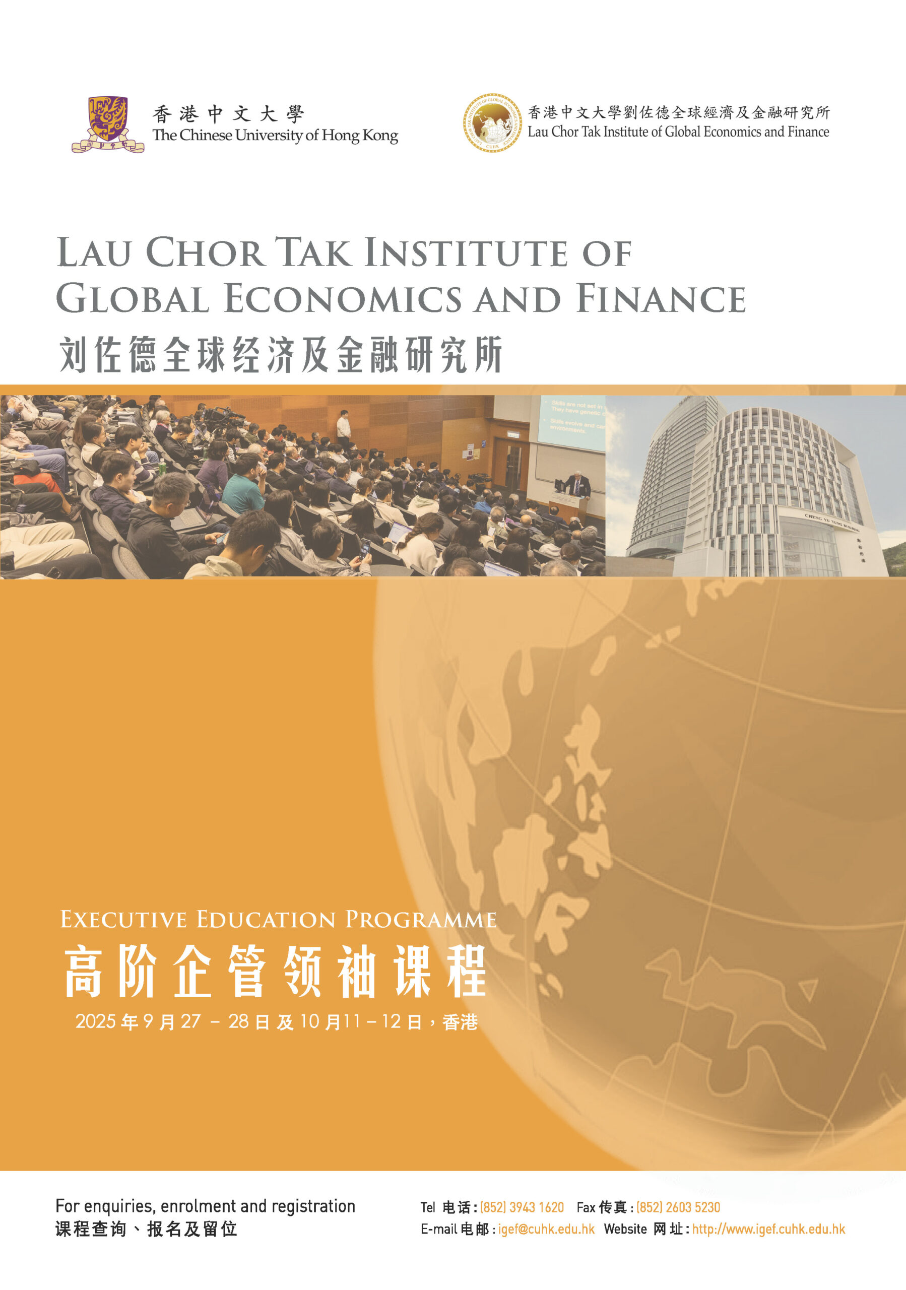 香港中文大学刘佐德全球经济及金融研究所特此推出「IGEF 高阶企管领袖课程(EEP)」,荟萃杰出学者和行业精英,通过一系列涵盖政经时局与科技应用的专题演讲,以及与讲师的对话,拓展高级行政人员的知识面和国际视野,助其多角度了解相关议题︒与此同时,学员间的互动,更是激发思维,探索发展的良机︒